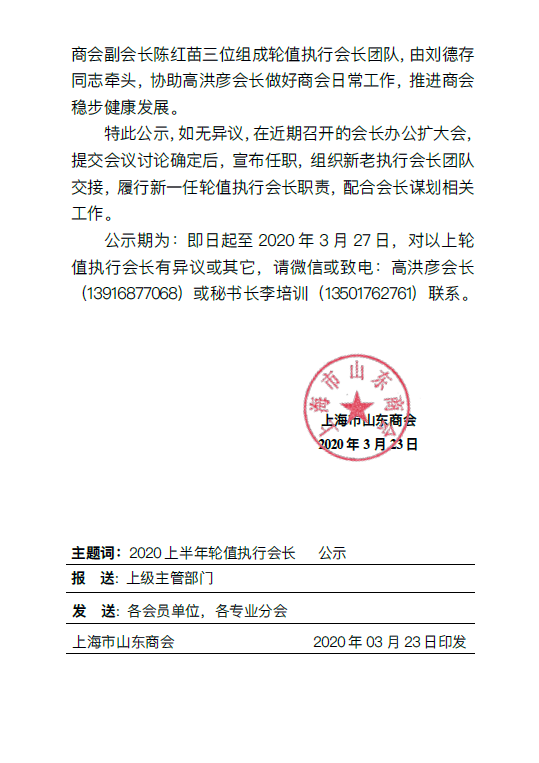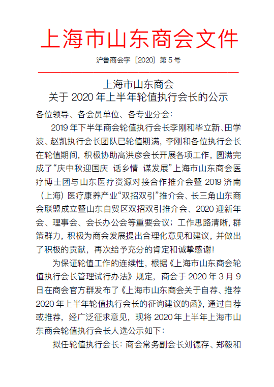上海市山东商会关于2020年上半年轮值执行会长的公示