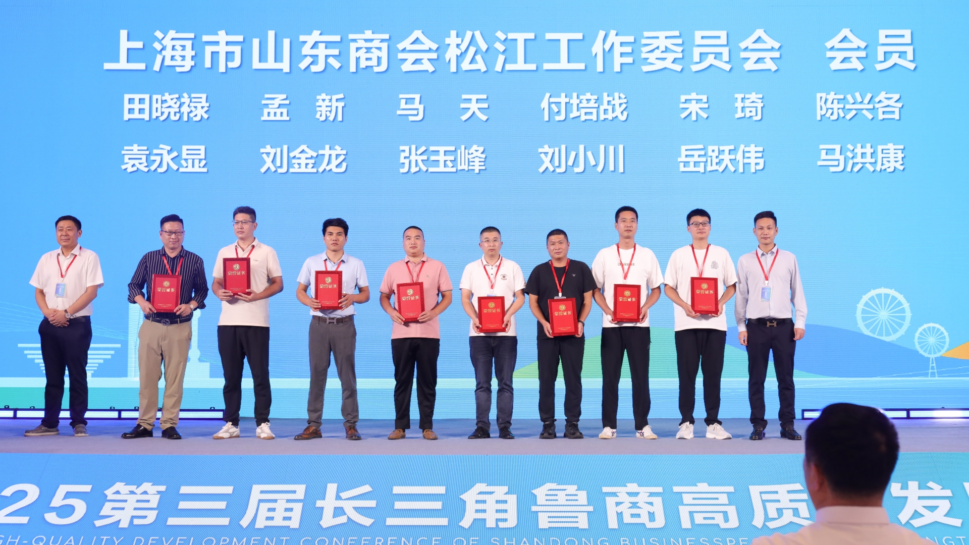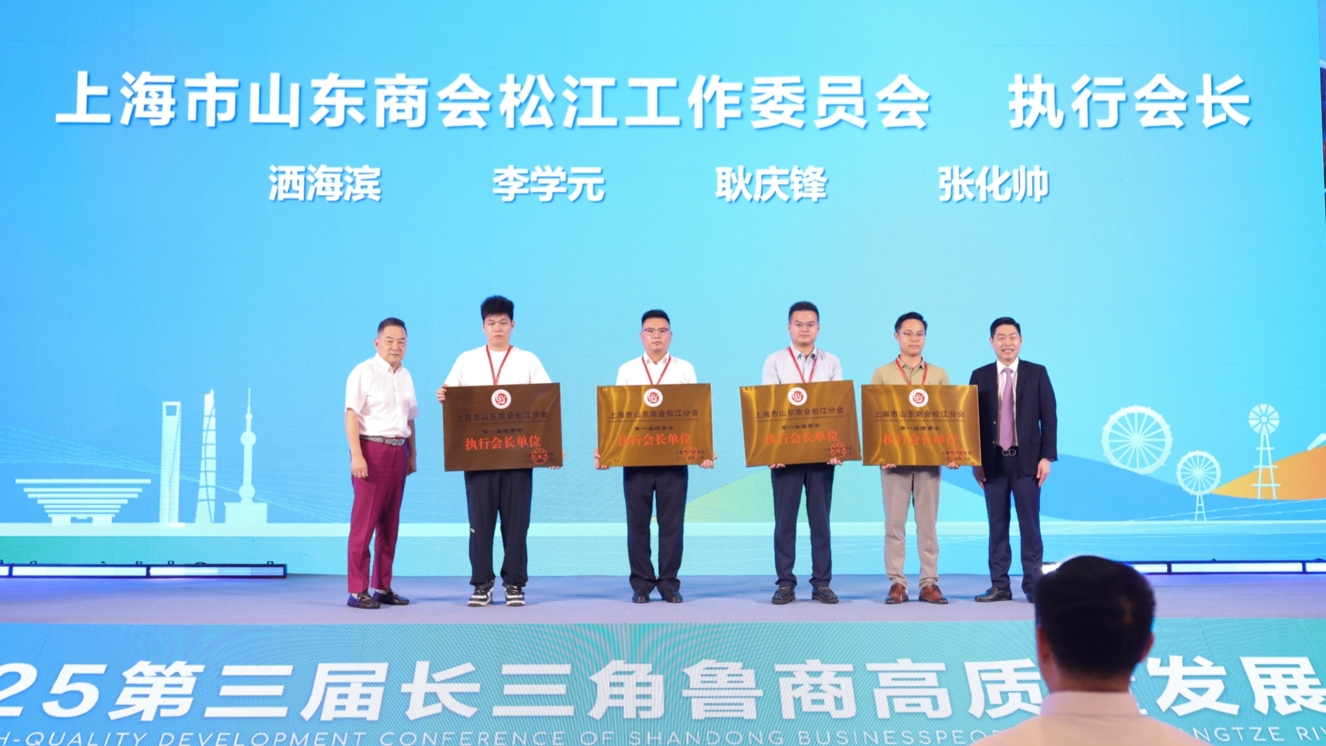 上海市山东商会高级顾问王卫与上海市山东商会松江工作委员会会长李召坤共同为执行会长洒海滨、李学元、耿庆锋、张化帅授牌。