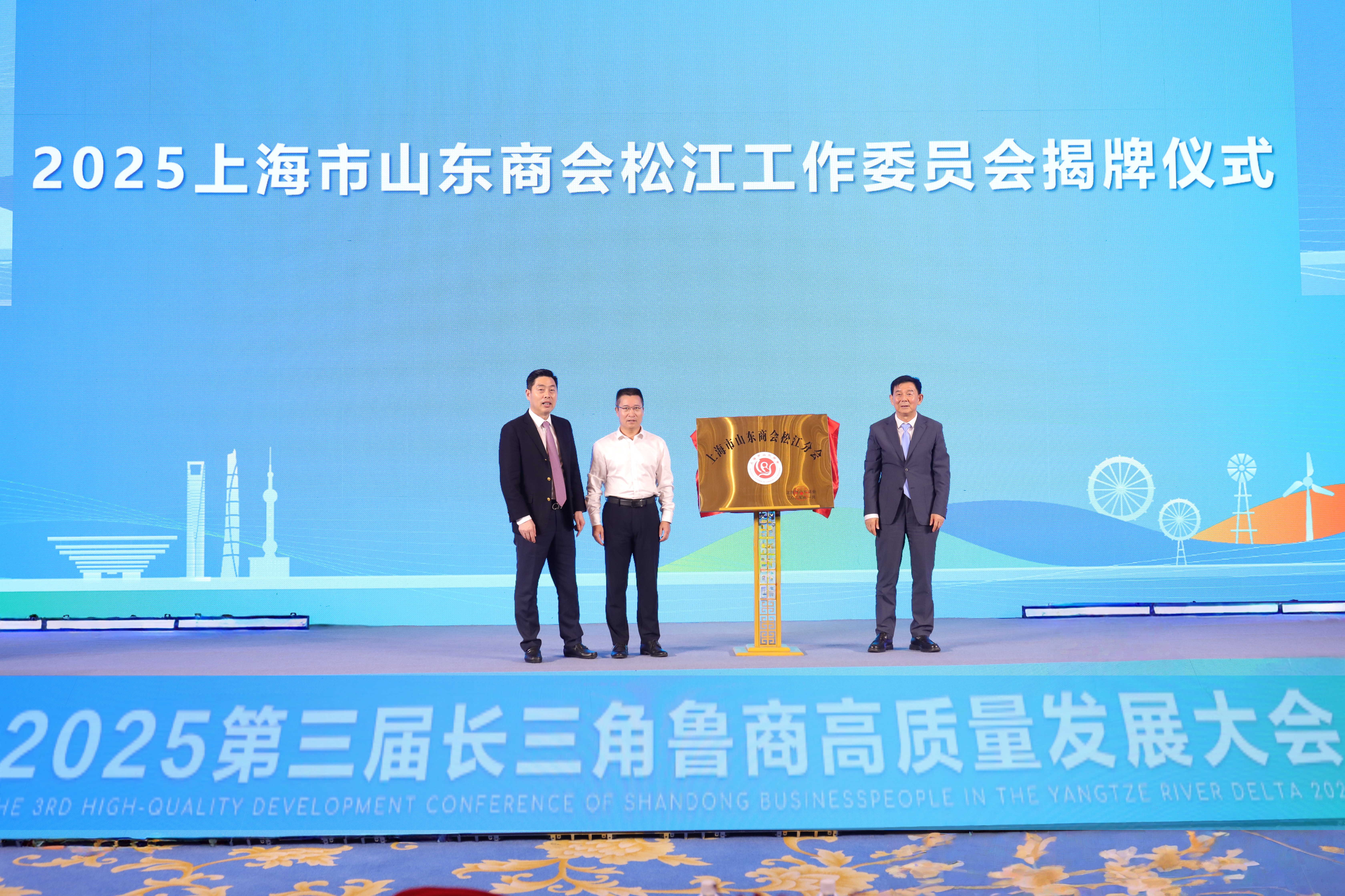 在揭牌环节中,山东省政府驻上海办事处副主任石云峰与上海市山东商会会长高洪彦共同为“上海市山东商会松江工作委员会”揭牌,全场以热烈掌声庆祝这一重要时刻。